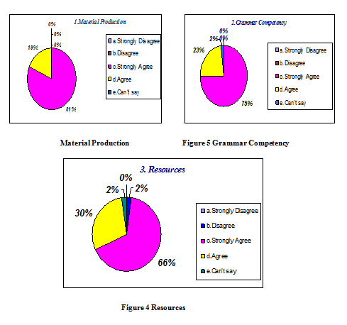 In the first category, i.e., material production 81% students strongly agreed and 19% students agreed. In the second category grammar competency 75% students strongly agreed and 23% students agreed and 2% students responded as ‘can’t say’. In the third category resources 66% students strongly agreed, 30% students agreed, 2% students disagreed, and 2% students responded ‘can’t say’. Thus the qualitative interpretation of the data of the questionnaire says the use of CALL material in teaching English grammar is accepted and appreciated, even it can get better results. The charts of the above data are as follow:
