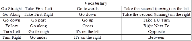 The same map-cued elicitation method was employed as the base to develop materials for the teaching of speaking. As the students were all beginners in the use of language, it was decided that the test and the practice tools be kept the same so that the students would be more comfortable in the use of both. Vocabulary that was to be used in the tasks has been taken from English Vocabulary in use (Pre-intermediate) by Stuart Redman. The following vocabulary was selected and integrated in the classroom activity:
