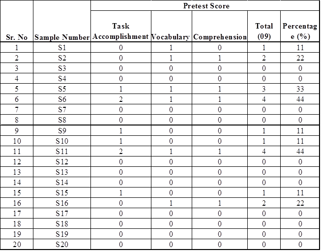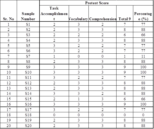 The pretest conducted showed alarming results, where most of the students scored very less on the rubrics mentioned above. The results of which are as follows: