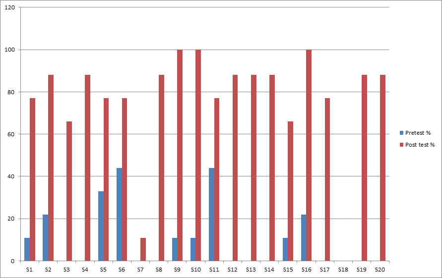 As is clear from Table 2, the performance of the students has increased in the post test. They were evaluated on the same parameters as before and were given the test of same difficulty. However, this time the students performed better than before. Each member of the team, who was nominated, was able to convey the directions effectively using short and simple sentences. The researchers also found that the students were far more involved during the tests, because they were able to see the real time significance of the conducted activity. 2 students did not show any improvement, while 2 are in the range of 60-70%, 5 are in 70-80%, 8 are in 80-90% and 3 students are in the 90-100% range. A comparative analysis of the pre and post test would clearly indicate the impact on students’ performance in the use of Intensive speaking. The comparative analysis is present below:
